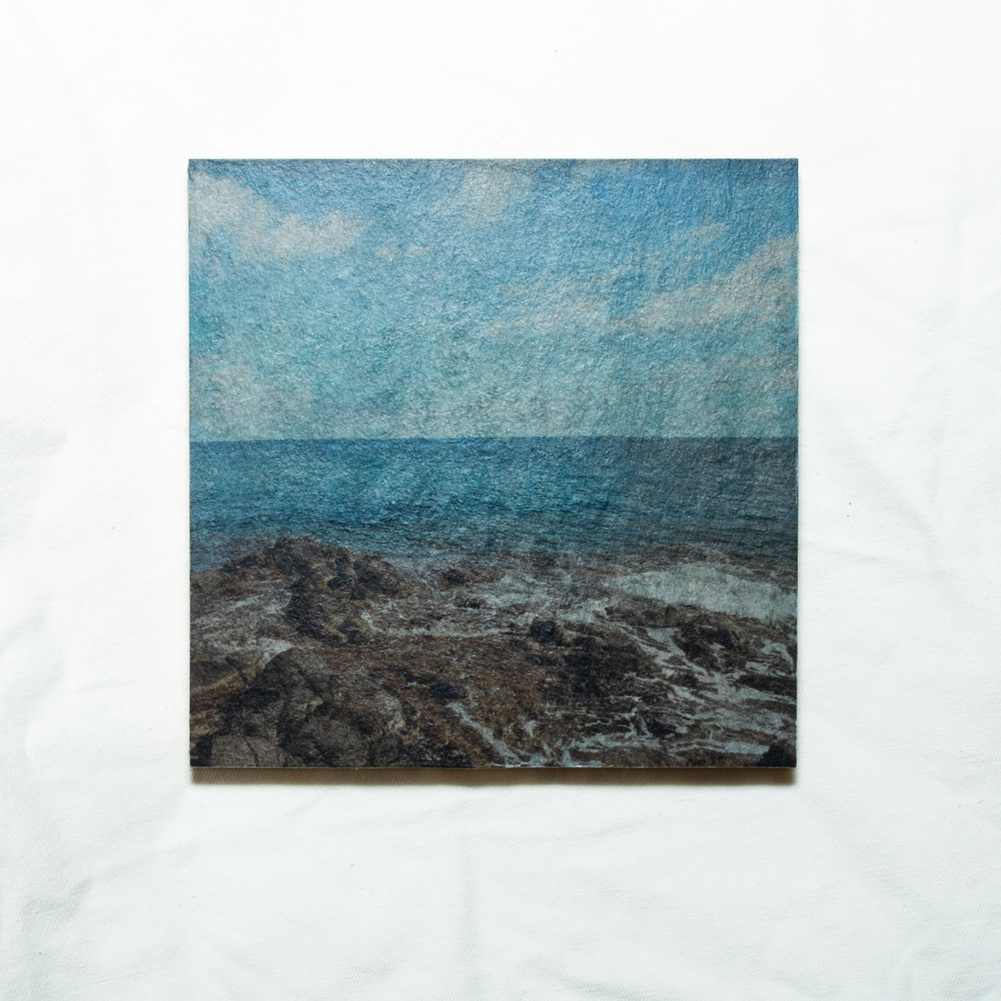 In a series of physical pieces, Elizaveta looks at the culture of today's digital age and how travel has transformed into a more accessible and convenient experience. Couch travelling has become commonplace, allowing us to explore unfamiliar and random places through the simple act of dragging and dropping a yellow human icon on Google Earth. However, this ease of exploration raises some questions about the role of landscape photography and its connection to the physical process. With the click of a button, we can view breathtaking landscapes from the comfort of our homes, leaving us disconnected from the true physicality of the environment portrayed. So how do we represent these environments, in a tangible and decaying form?